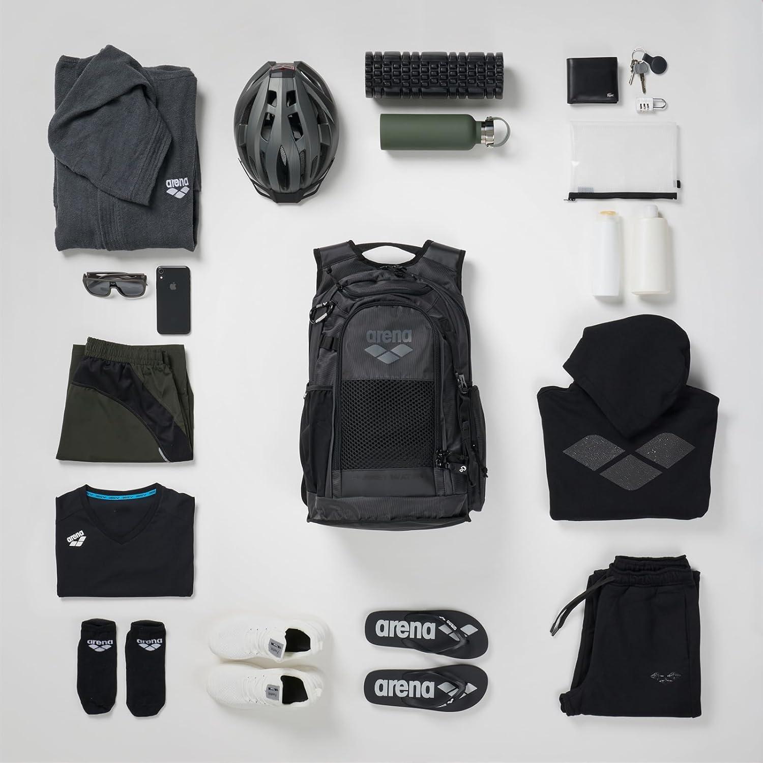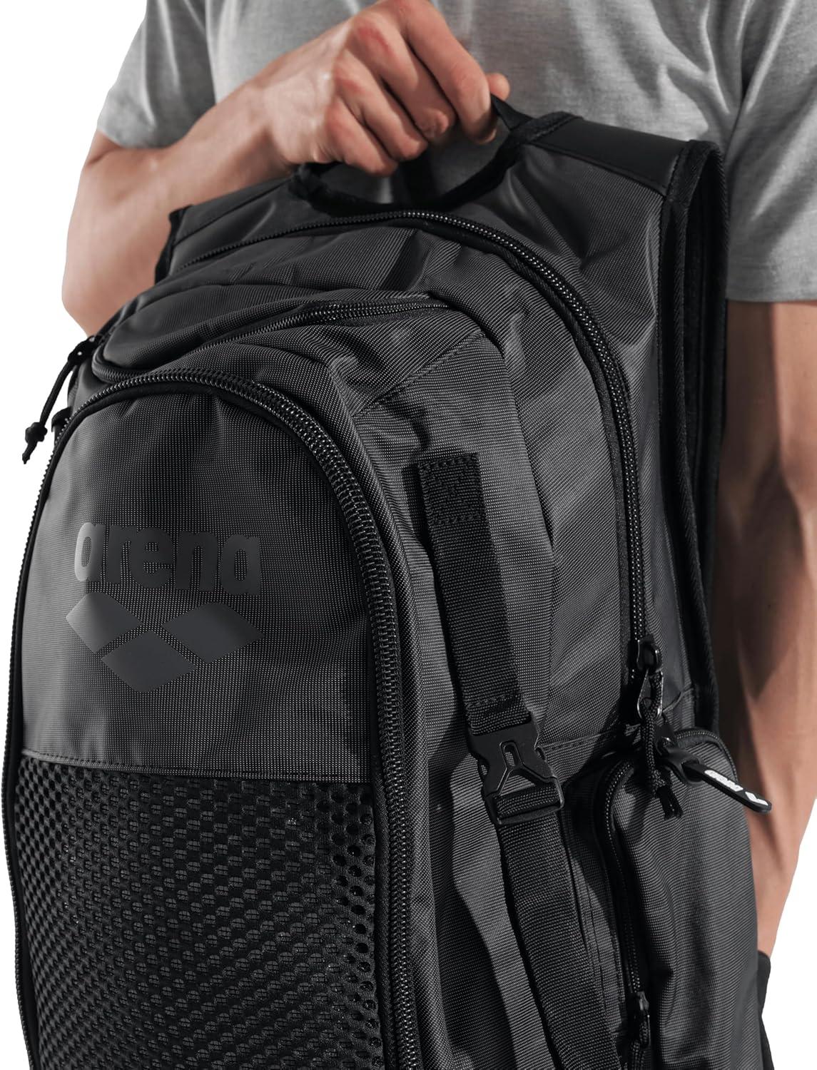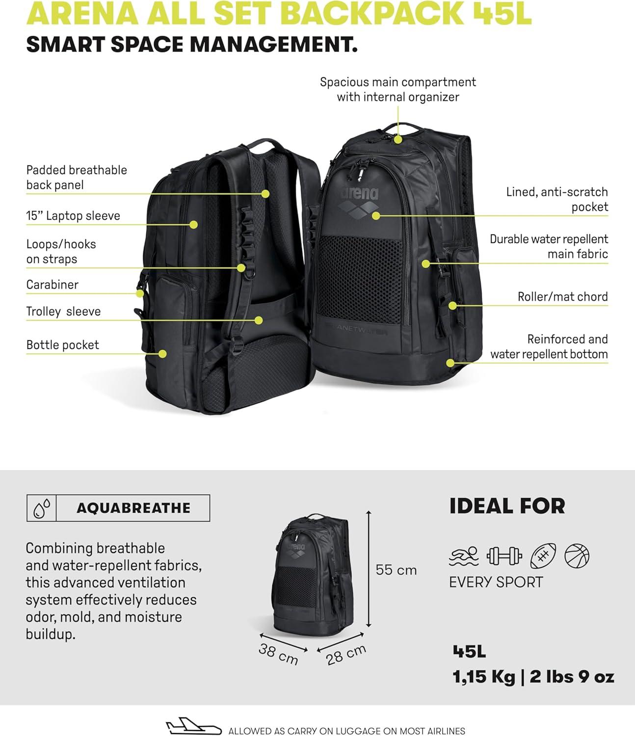 ARENA All Set Sports Swim Backpack Athletes Gym Rucksack Multisport Daypack Large Size Training Gear Equipment Bag 45 Liters(Black)