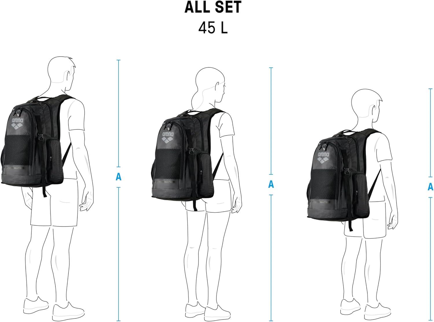 Benefit from the clever space management of the ultra stylish arena All Set Backpack 45L that makes it easy to organize all your stuff. Featuring Aquabreathe, arena's new wet management system, it combines breathable inserts and water-repellent fabrics to create an advanced ventilation system that keeps water out and your gear dry. Two large main compartments and two external zipped front pockets make it easy to access all your gear. Equipped with a laptop sleeve and an additional side mesh pocket for storing a water bottle. Featuring a smart mat holder, a carabiner for convenient hanging and a practical strap for secure attachment to a suitcase. Finished with a water-repellent reinforced bottom and main fabric, it protects your gear from moisture and dirt. The breathable padded back panel ensures comfortable and sweat-free transport. Dimensions: 21.7 in x 15 in x 11 in, 45 liters.