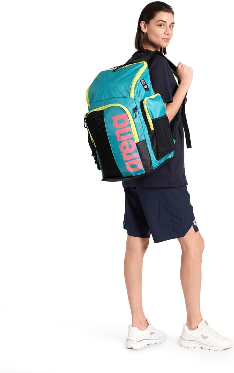 Swimmers love this ultra smart and eye-catching backpack! The spacious, comfortable and super stylish arena Spiky III Backpack 45 is specially designed for swimmers. The top-loading main compartment, three zip pockets, mesh side pockets and a separate swimbag for wet garments ensure excellent storage space for all your training gear. Equipped with mesh compartments and a water-repellent fabric to keep moisture under control. The padded breathable back panel and ergonomic shoulder straps provide outstanding comfort. The reinforced bottom protects stored contents from wet floors. Available in various eye-catching and fun designs. Dimensions: 19.7 in x 14.2 in x 10.6 in, 45L capacity.