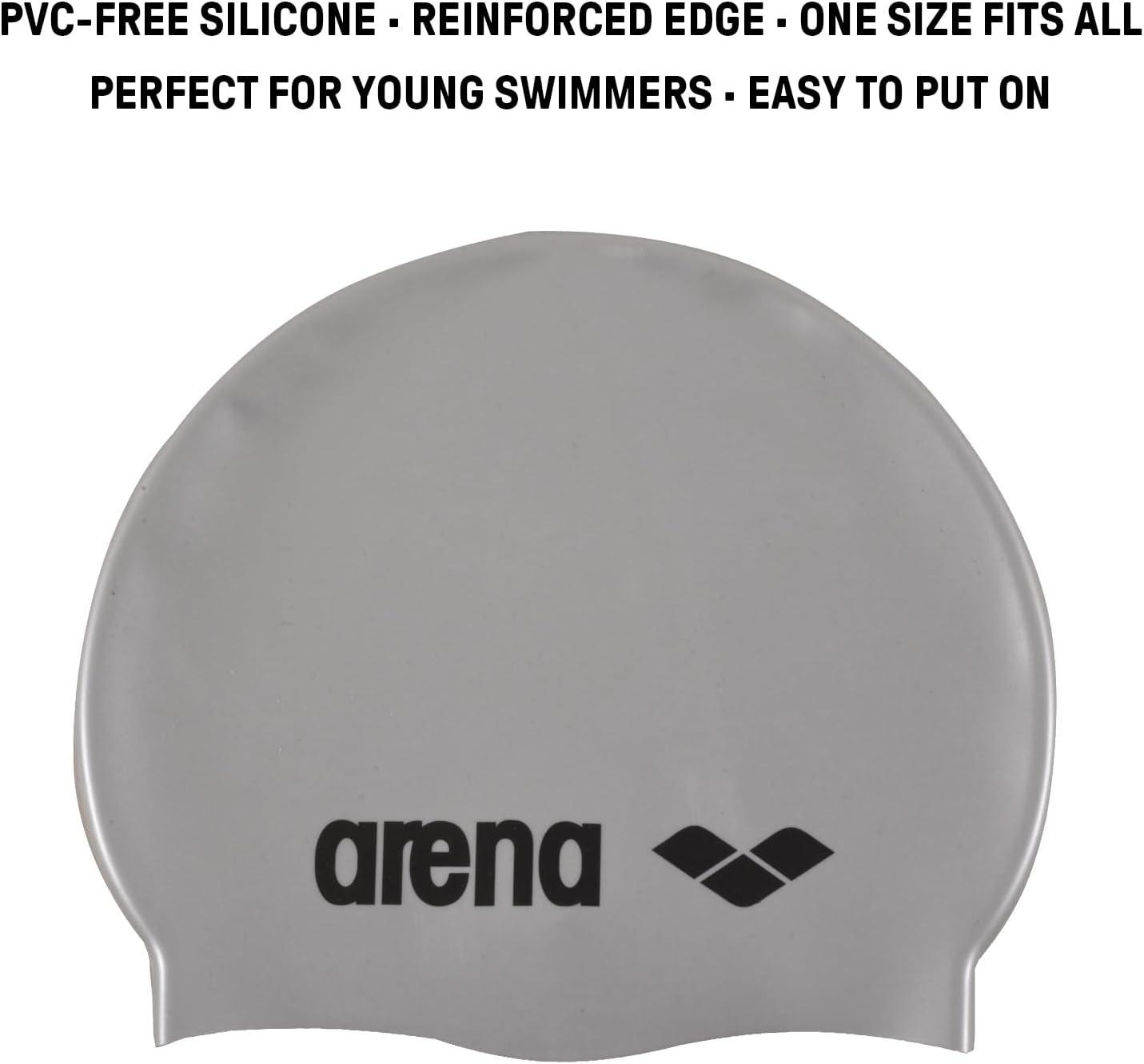 Arena Classic Junior Silicone Unisex Swim Cap for Girls and Boys Comfortable Durable Kids’ Pool Bathing Cap, One Size(Silver/Black)