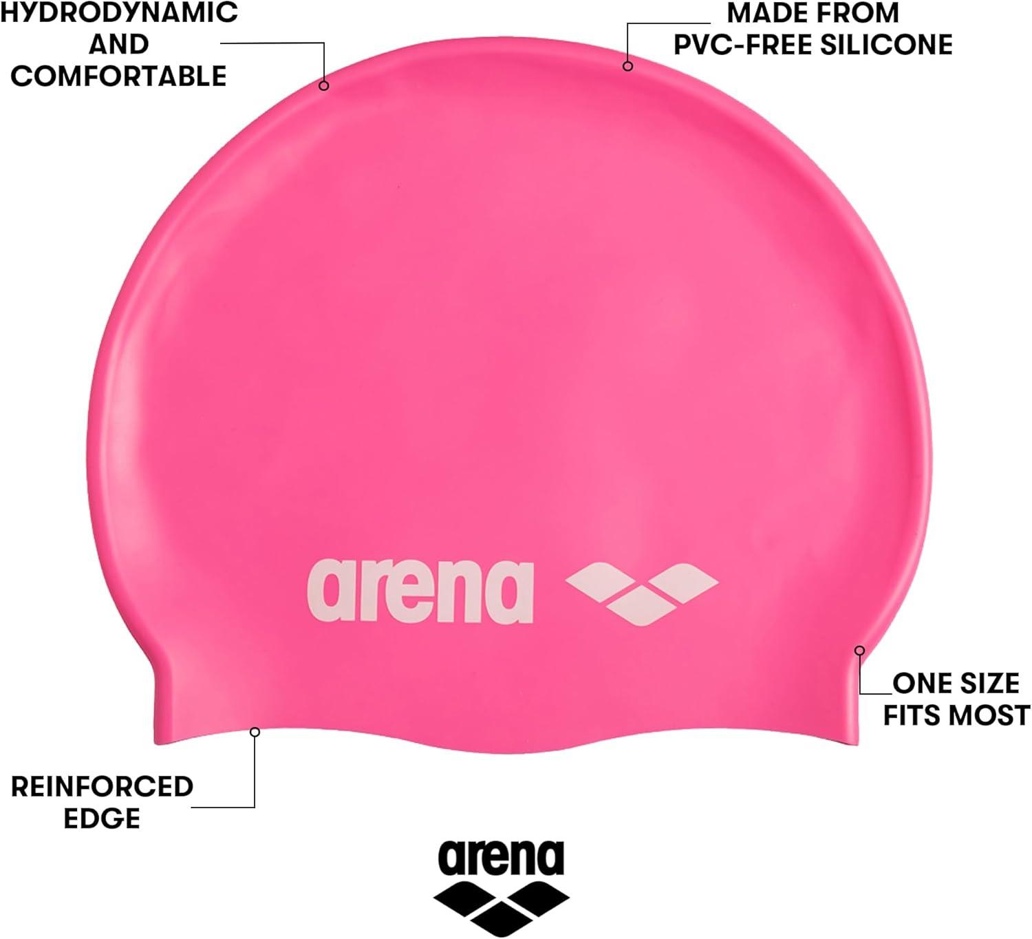 The comfortable and durable arena Unisex Swim Cap Classic fits perfectly for different head shapes. Its hydrodynamic design streamlines the head for reduced drag and its durable silicone construction protects the hair from chlorine. The reinforced edge prevents the cap from riding up and provides a classic stable fit. Good for everyday use and training. PVC free. Make your swim cap last even longer by washing it in fresh water after use and air drying it away from radiators or other heat sources. Available in multiple solid colors.