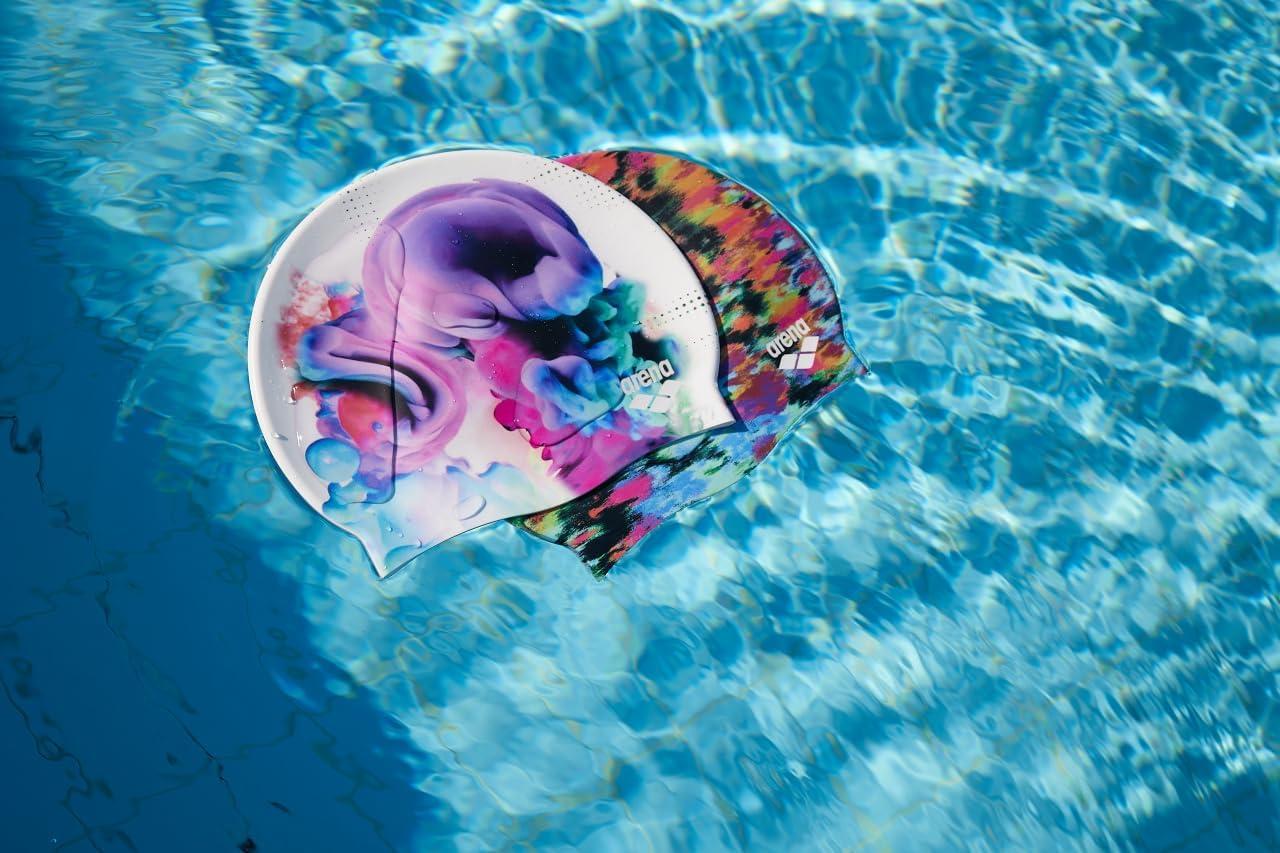 Brighten the pool in this eye-catching swim cap ideal for fitness swimmers. The comfortable and durable arena Unisex Swim Cap HD fits perfectly for different head shapes. Extra-stretchy and chlorine resistant for comfort and longevity, this cap provides a perfectly sealed and smooth fit. Its hydrodynamic design streamlines the head for reduced drag and its durable silicone construction protects the hair from chlorine. The reinforced edge prevents the cap from riding up while the special peach-touch silicone material ensures improved stability and fit. PVC free. 100% silicone. Make your swim cap last even longer by washing it in fresh water after use and air drying it away from radiators or other heat sources. Available in various funny designs with realistic photo images.