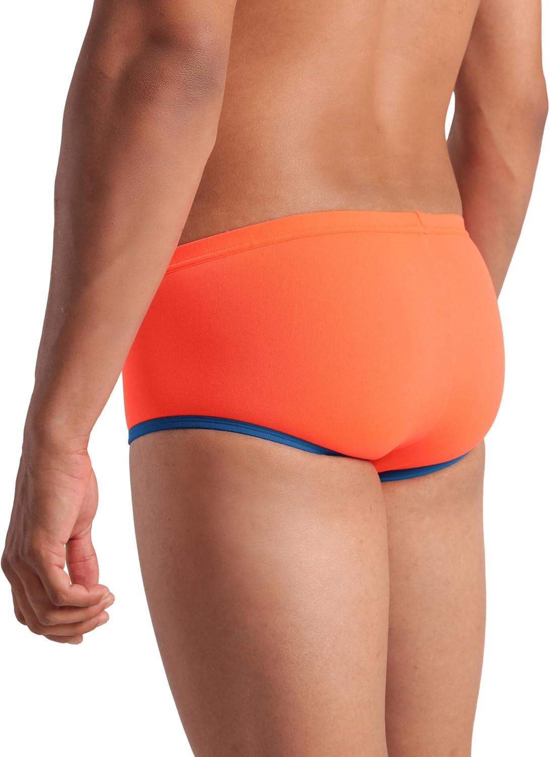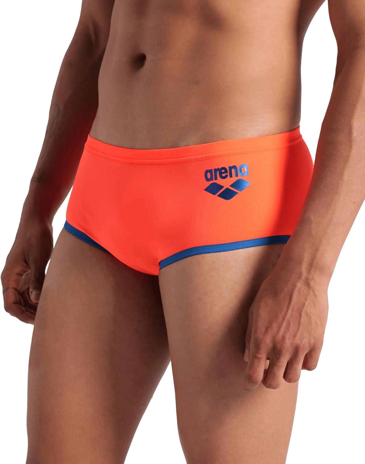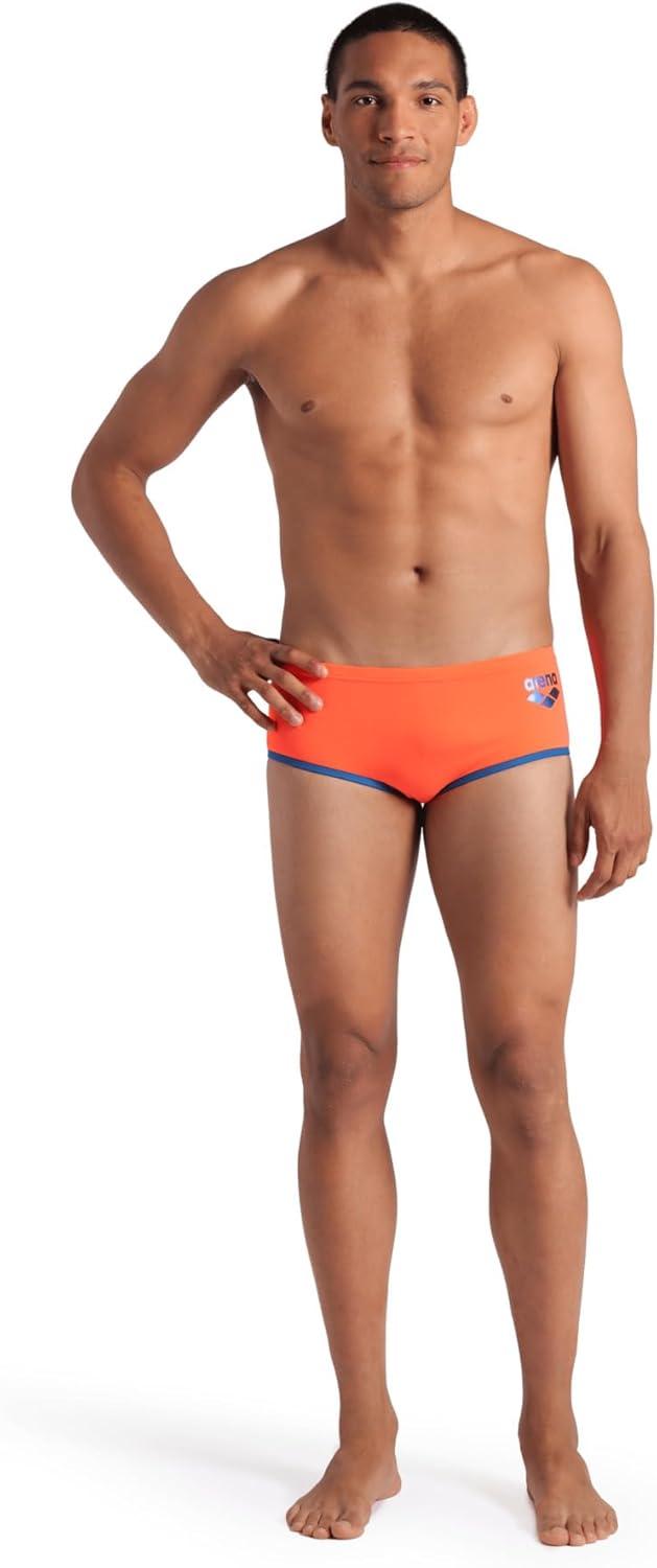 Arena Mens Arena One Men’s Big Logo Low-Waist Swim Short Pool Practice Athletic Swimsuit(Bright Coral/Blue Cosmo)