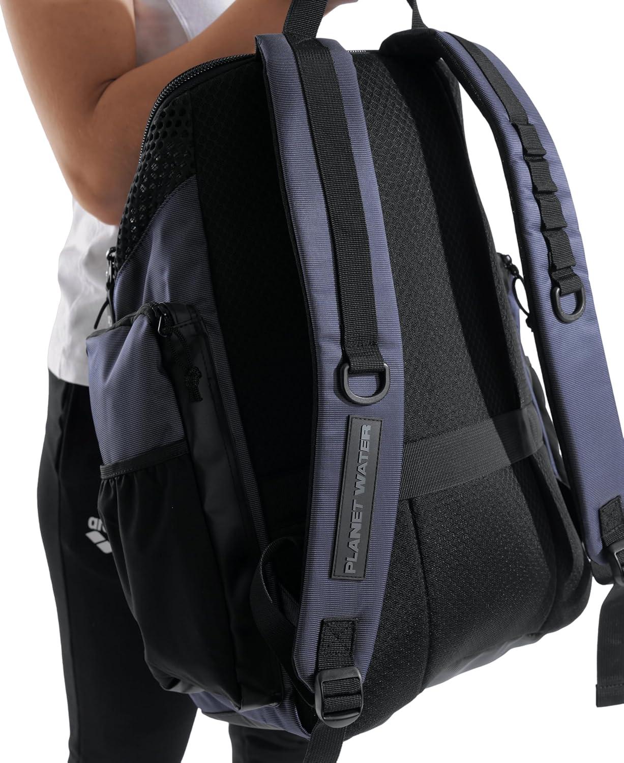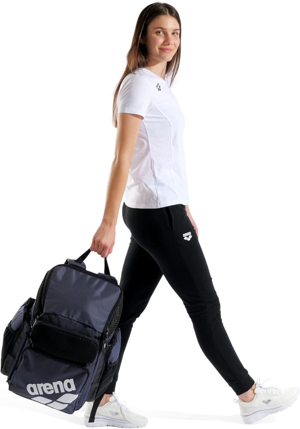 Organize all the stuff you need for your training. The large arena One Go Backpack 45L with a top-loading design makes packing and accessing your belongings easy. The roomy main compartment and four external zipped front pockets offer various storing options. Breathable and watertight inserts are engineered to keep wet and dry items apart. Featuring a smart laptop sleeve and two external bottle pockets. Aquabreathe, arena's new wet management system, combines breathable and water-repellent fabrics to create an advanced ventilation system that keeps water out and your gear dry. The breathable back panel ensures sweat-free transport. Equipped with a practical strap for easy attachment to a suitcase, this backpack is easy to hang with the included carabiner. The water-repellent bottom and main fabric offer protection from moisture and dirt. Dimensions: 19.7 in x 15.7 in x 9.8 in, 45 liters.