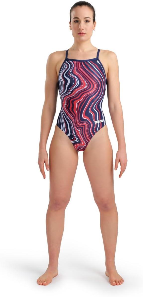 ARENA Performance Marbled Women’s Swimsuit Light Drop Back One Piece MaxLife Pool Training Bathing Suit Athletic Sports Swimwear, Navy/Red Multi, US Size 42