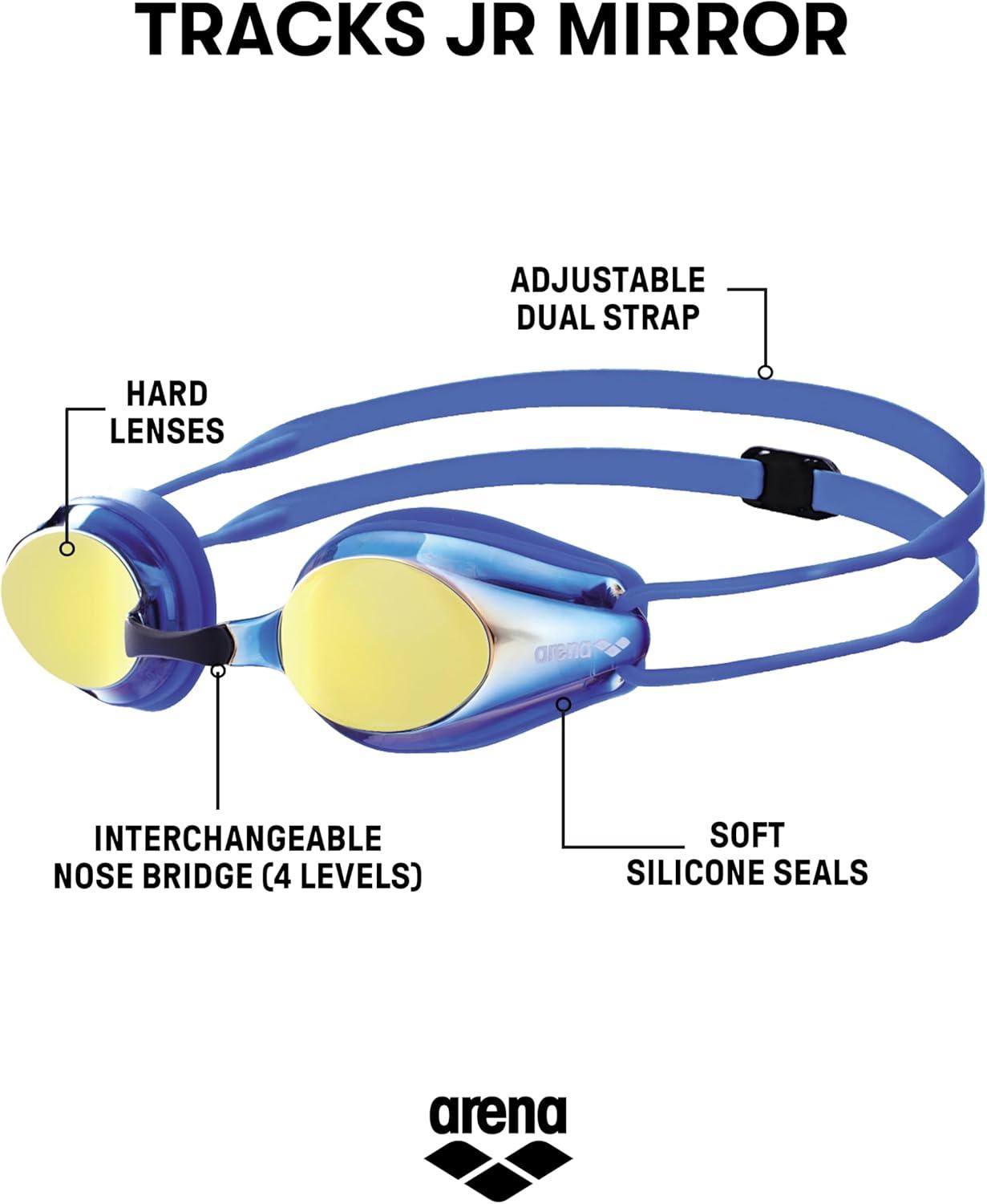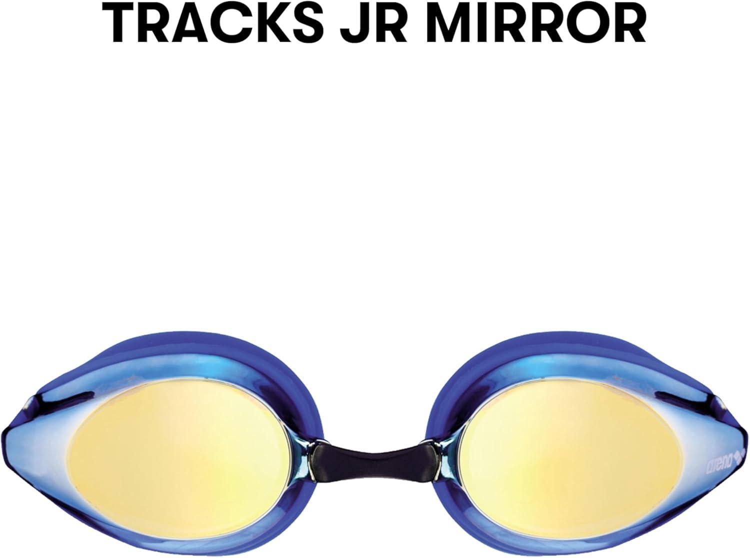 ARENA Tracks Unisex Junior Youth Essential Racing Swim Goggles Kids Swimmers Young Racers Anti-Fog Coated Mirror Lens, Violet/Fuchsia/Green(Yellow Copper/Blue)