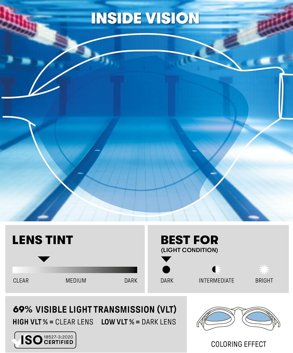 Extra comfortable training swim goggles for fitness swimmers featuring Air Seals designed to reduce pressure on the eye socket and the pain caused by suction on sensitive areas