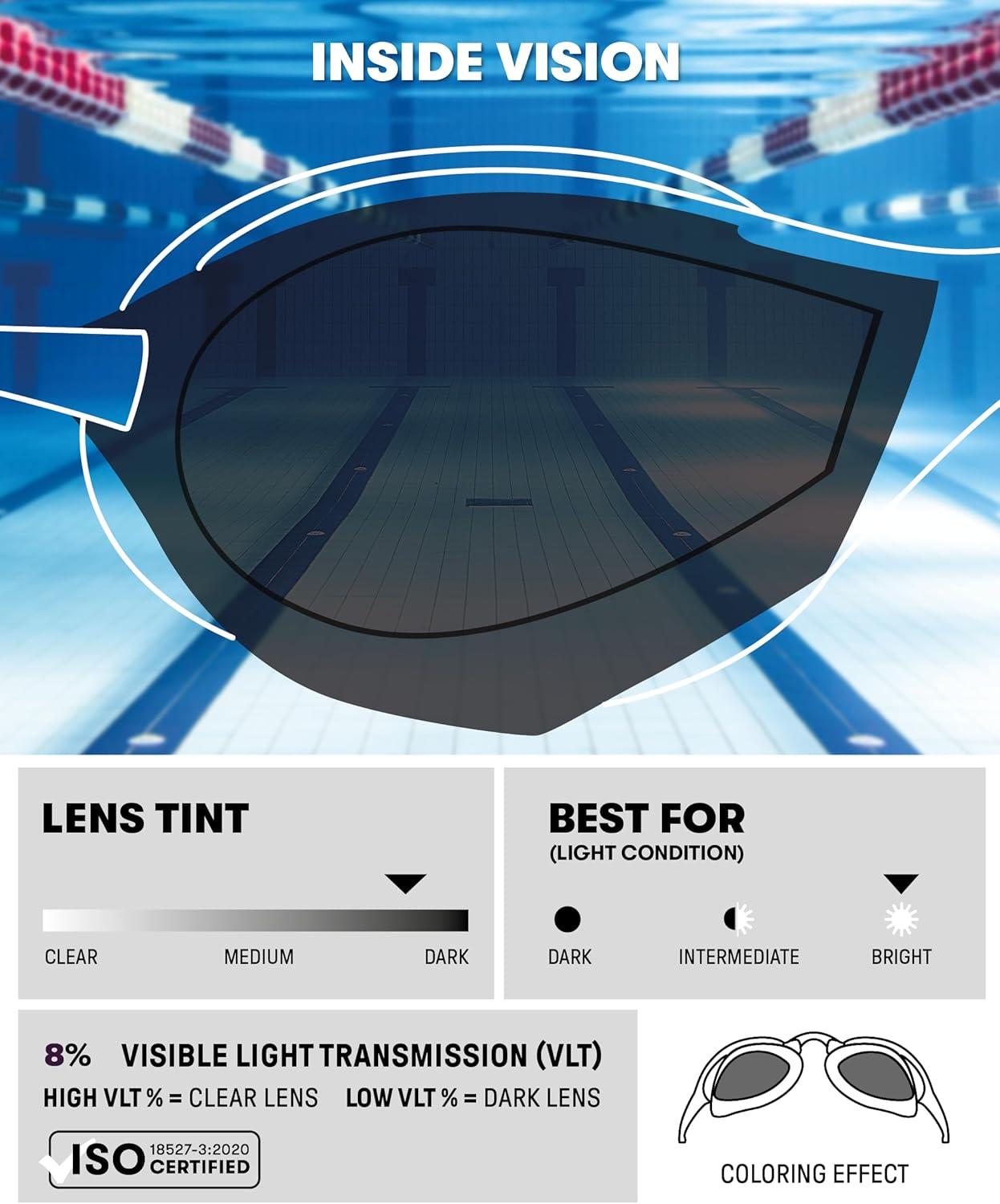 Low profile racing goggles designed for a tight fit in the eye socket, prioritizing hydrodynamics and stability, with a thin gasket (over molded on lens) for perfect comfort and watertight seal