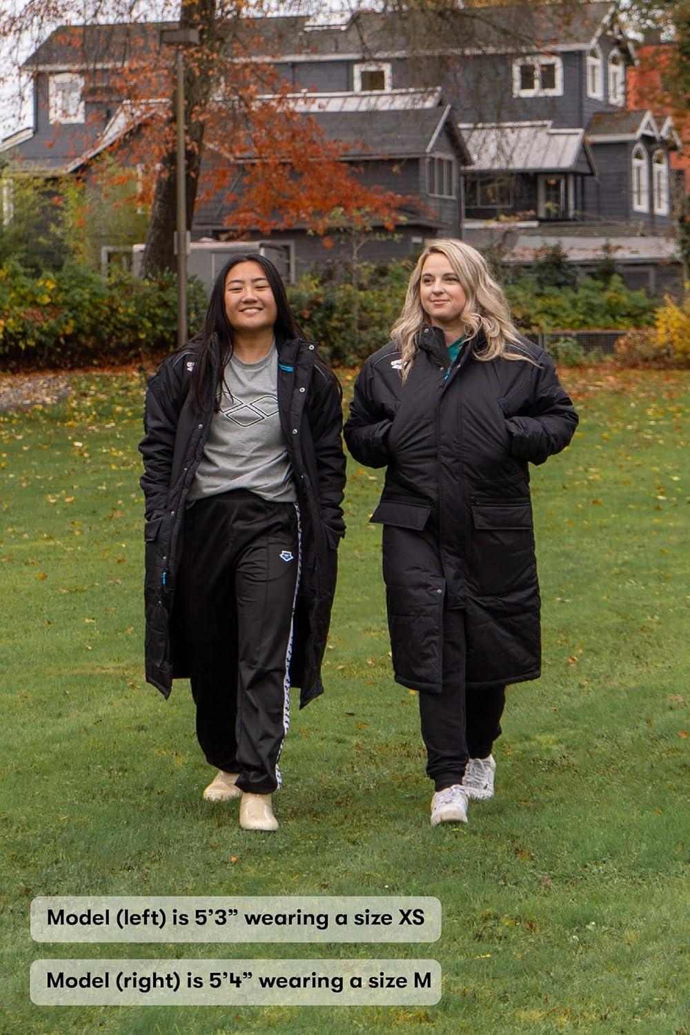 Get ready for colder climates with our team line parka. Warm and stylish, the arena Team Unisex Solid Parka is cut from a waterproof recycled fabric, padded and lined with microfleece for extra warmth. The outer layer of this long jacket has a drawstring hood and waist for a sealed in fit and insulation. Fitted with double pockets, hand-warmer pockets and inner pockets, this logo-stamped jacket is a great choice for colder weather. Use the large front flap pockets for your personal items and technology. Comfortably confront the crisper temperatures in this sleek anorak jacket, perfect for swimmers. Additional features of this excellent parka for athletes: two-way heavy-duty zip and snap buttons for extra insulation, underarm ventilation eyelets to prevent moisture penetration and provide moisture management, internal draw cord for better fit, raglan sleeves for freedom of movement, reflex taping along the sleeves and barrel lock hood bungee to lock cold out. If in between two sizes, select the smaller one.