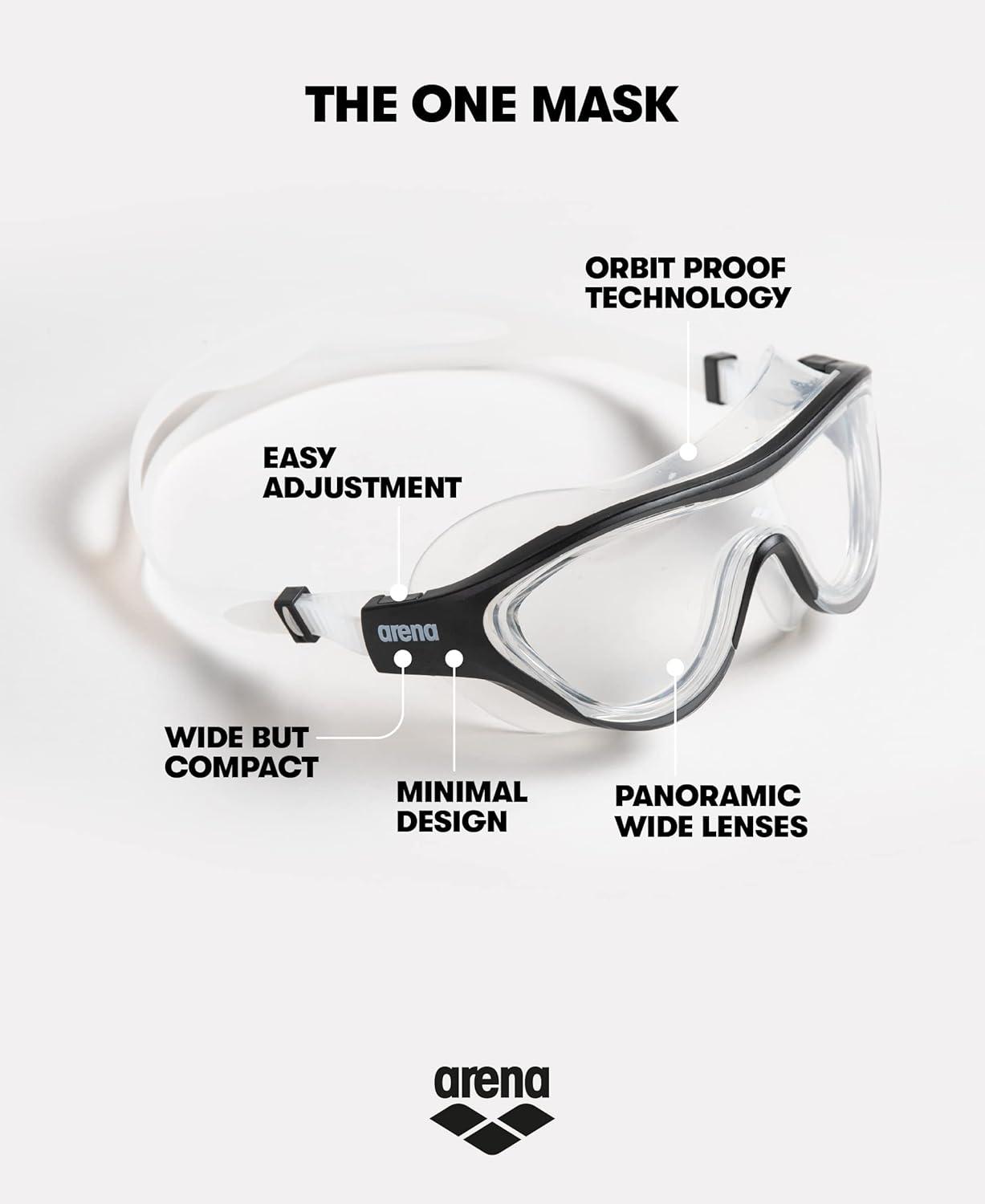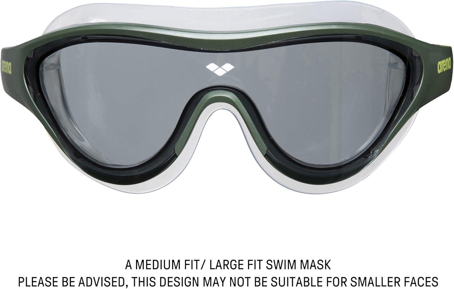 A medium fit / large fit swim mask, The One Mask goggle has mirrored lenses and soft seals that adapt to most faces; Please be advised, this design may not be suitable for smaller faces