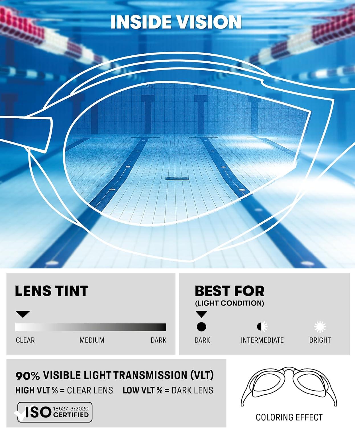 These fogless goggles for adults offer wide vision and maximum comfort at top speed with hard mirror polycarbonate lenses that have a hydrodynamic low-profile to minimize water drag; PVC free