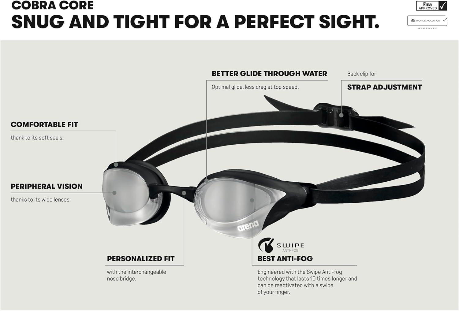 Arena Unisex Cobra Core Swipe Anti-Fog Racing Swim Goggles for Men and Women Polycarbonate Mirror/Non-Mirror Lens(Emerald/Plum/Black)