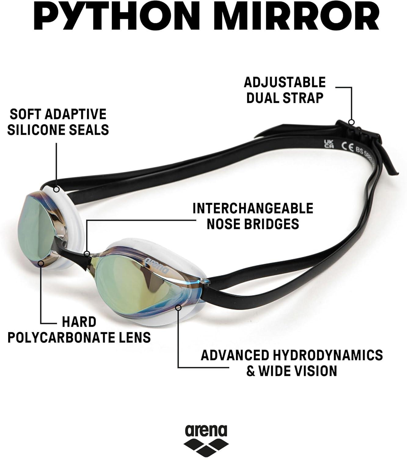 ARENA Unisex Python Racing Swim Goggles for Men and Women Anti-Fog No Leak Max Comfort Dual Strap, Mirror/Non-Mirror Lens(Gold-white-black)