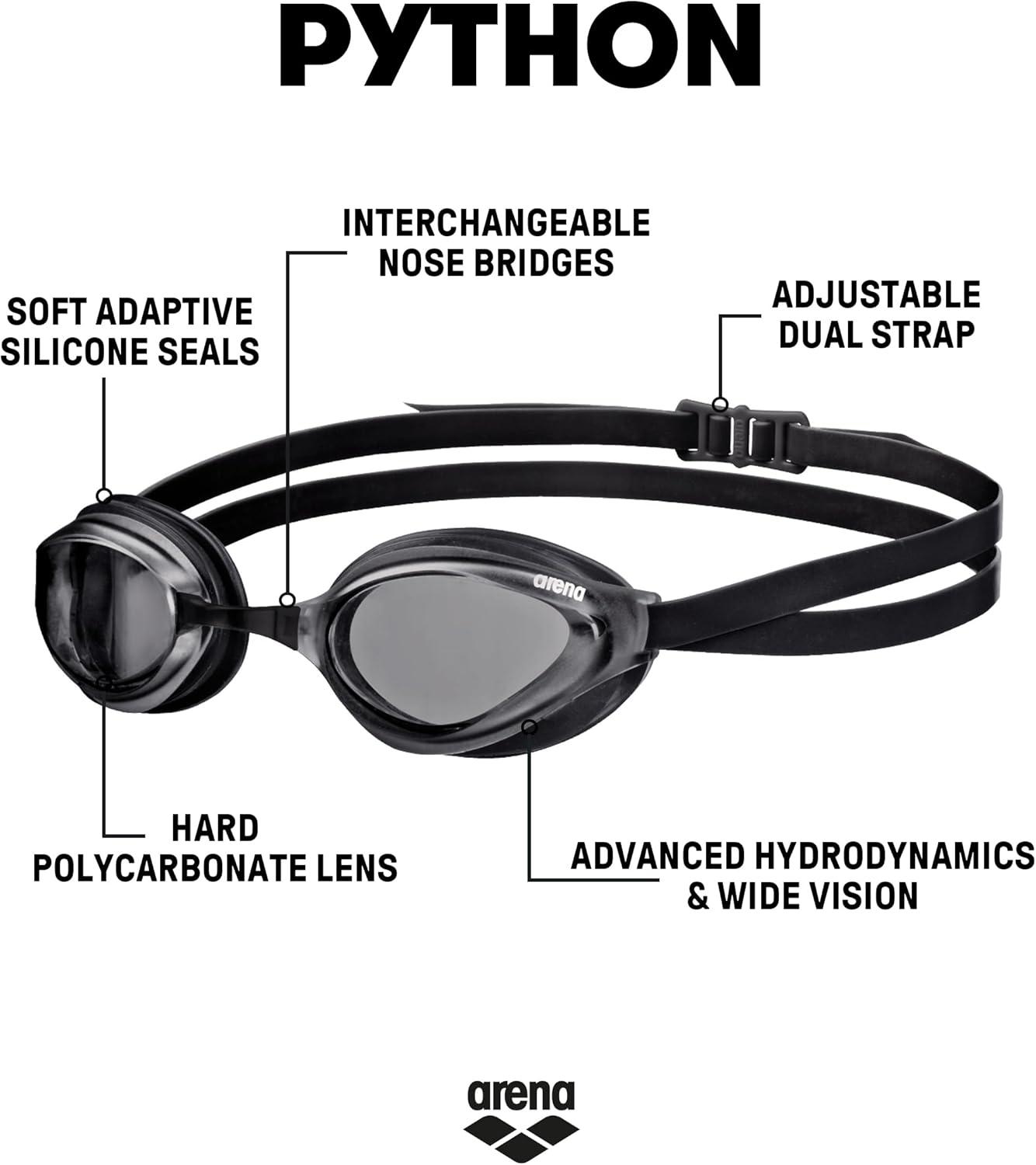 ARENA Unisex Python Racing Swim Goggles for Men and Women Anti-Fog No Leak Max Comfort Dual Strap, Mirror/Non-Mirror Lens(Smoke/Black)