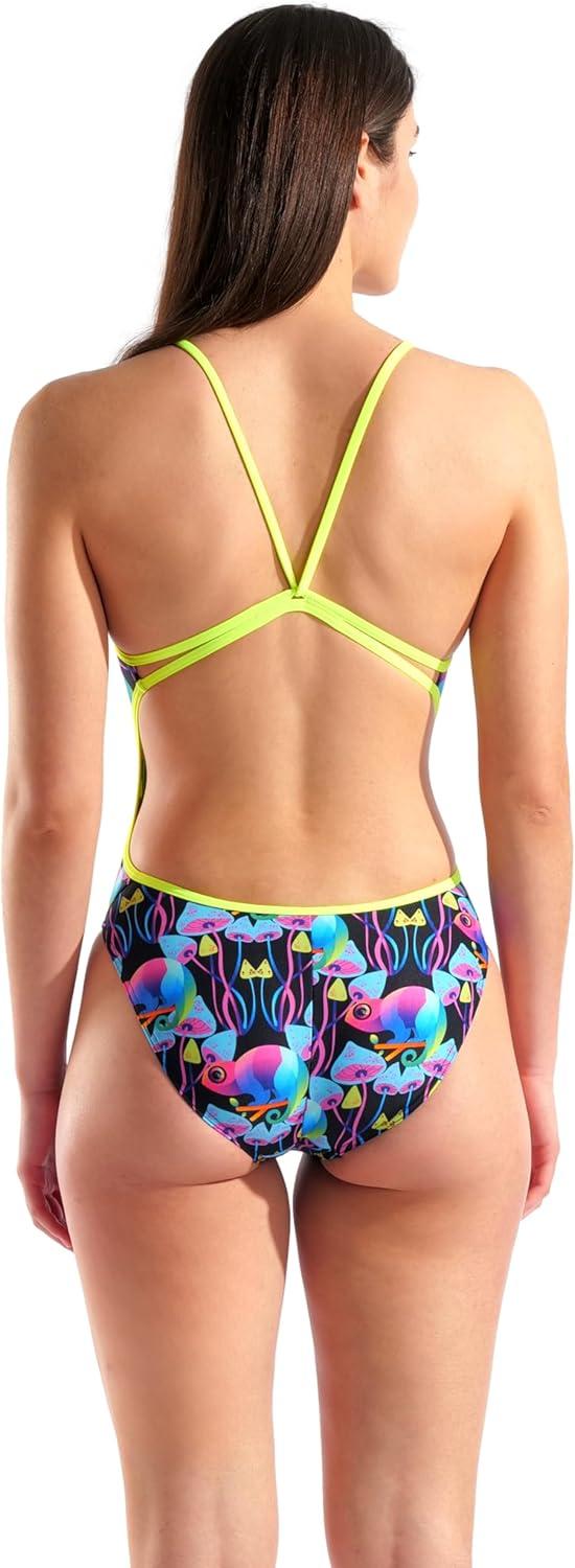 Arena Womens Arena Performance Women’s Multi Chameleons Lace Back Swimsuit Sports Bathing Suit(Multi Black/Arctic Lime)