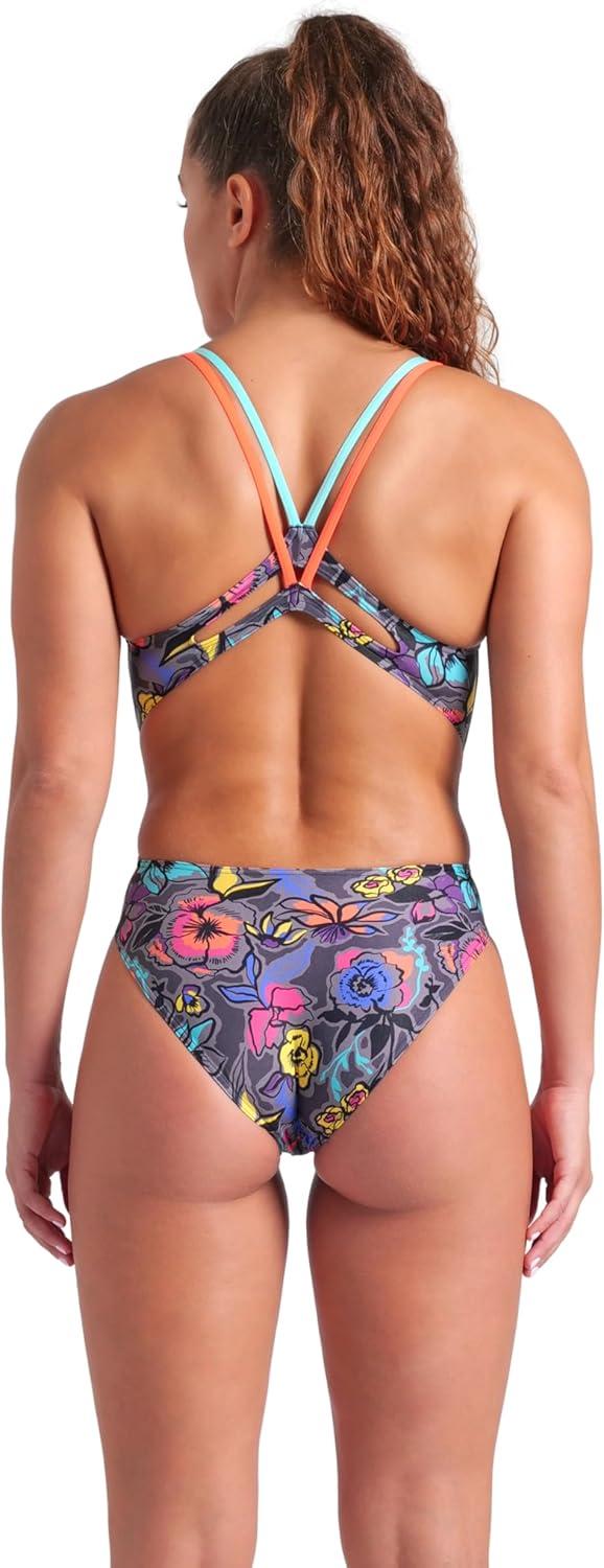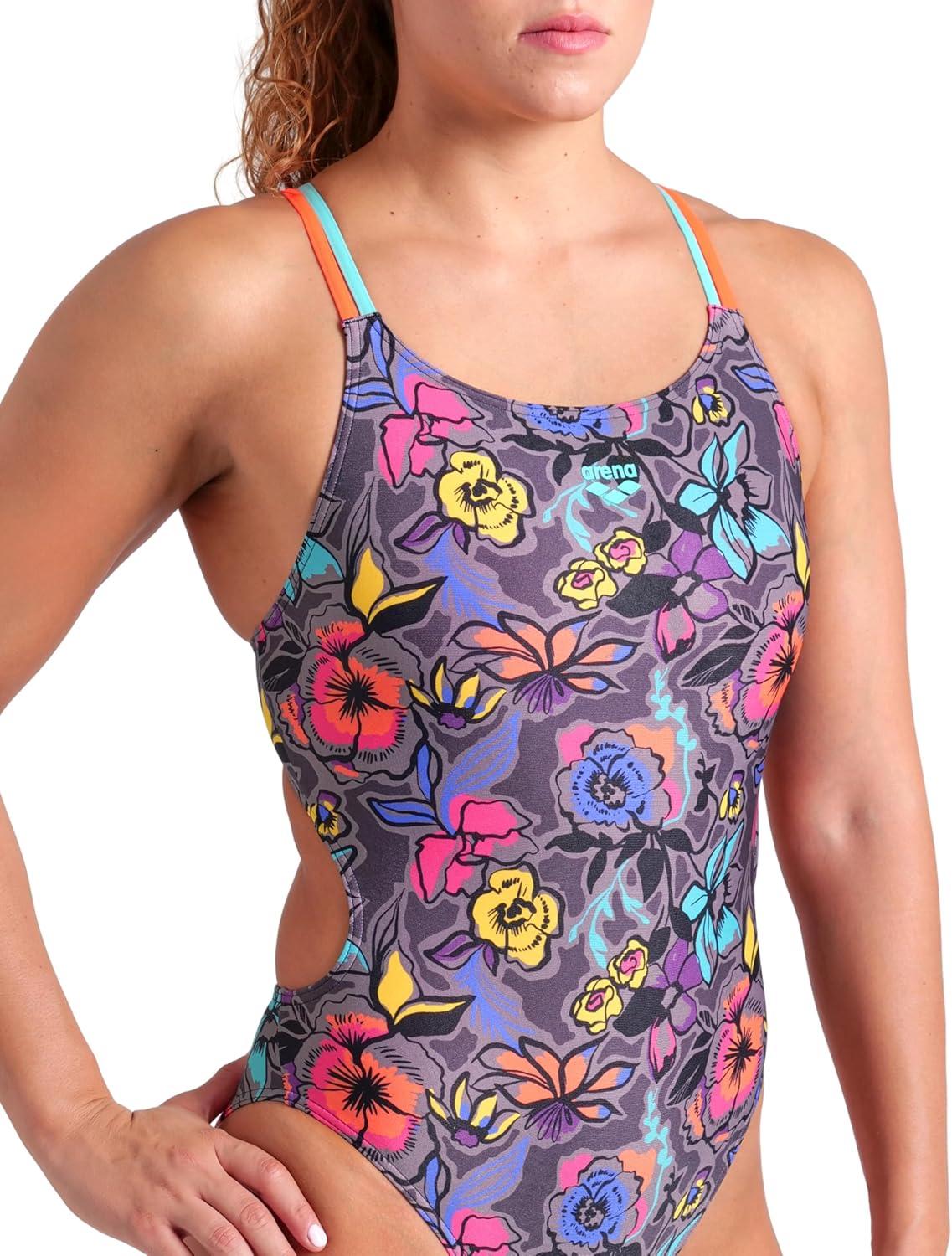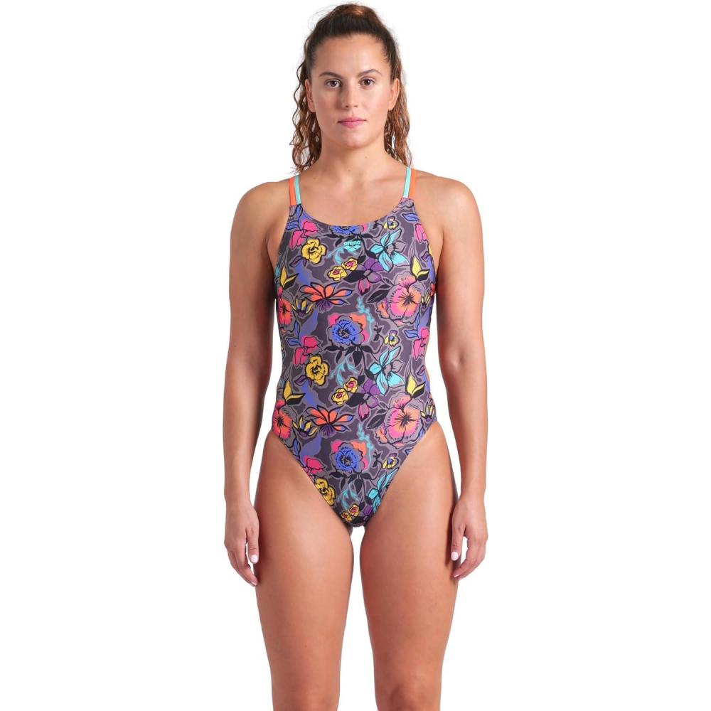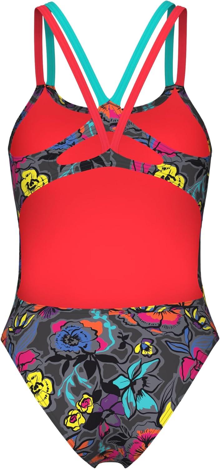 Arena Womens Arena Women’s Performance Vivid Repeat Swim Lace Plus Back One Piece Swimsuit(Grey Multi/Water/Bright Coral)
