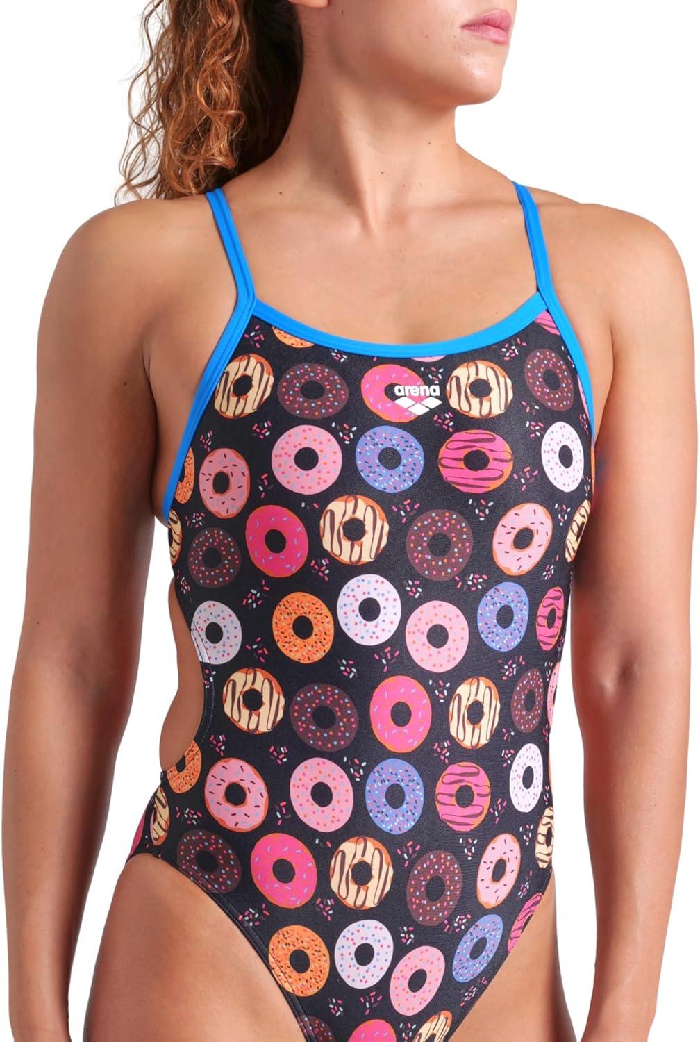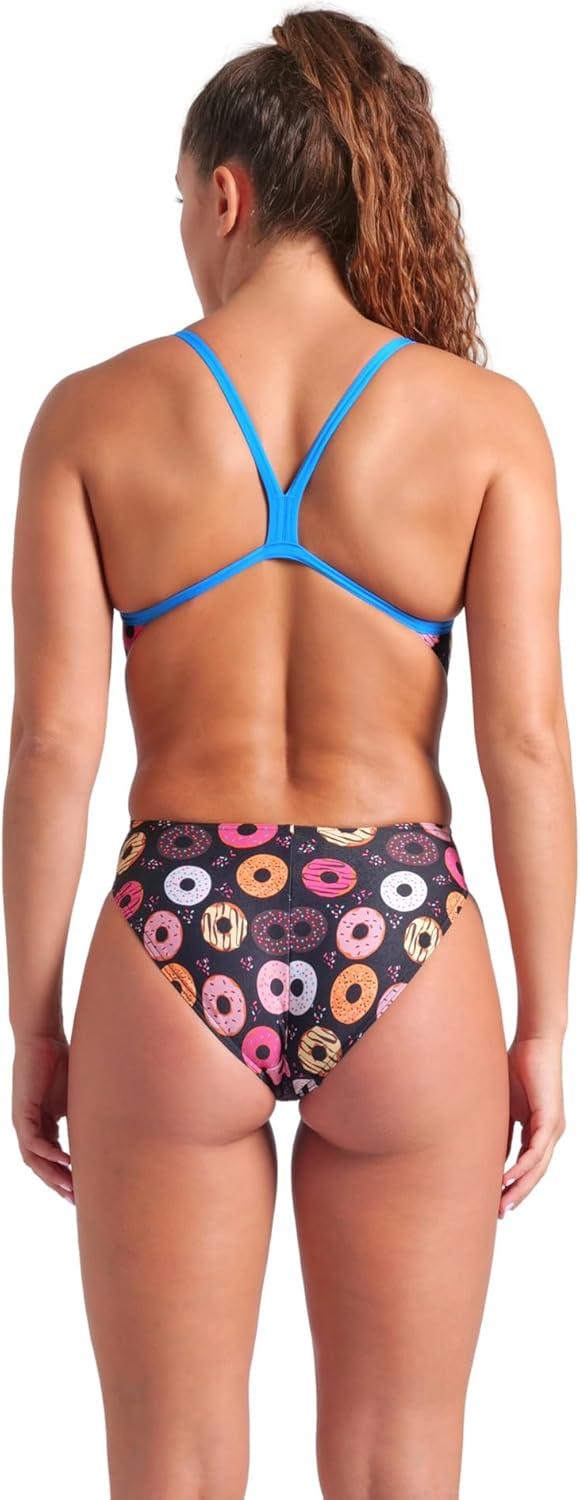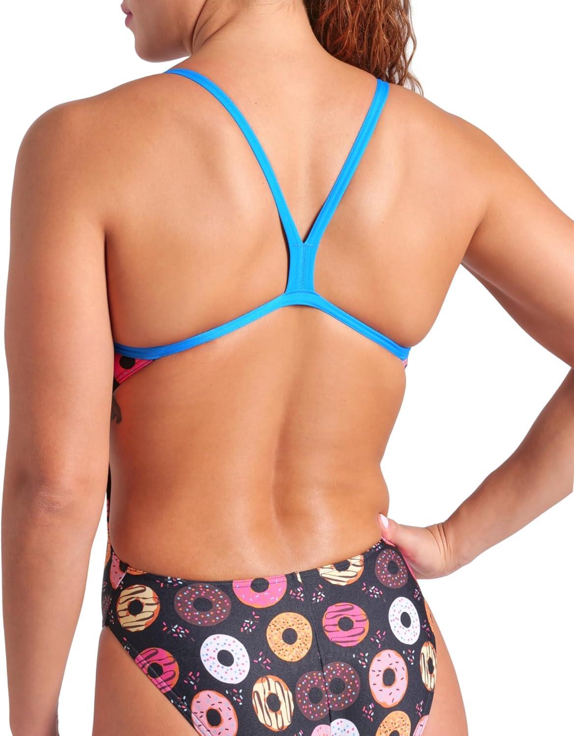 ARENA Women’s Performance Funny Prints Collection Donuts Challenge Back Swimsuit(Black Multi/Blue River)