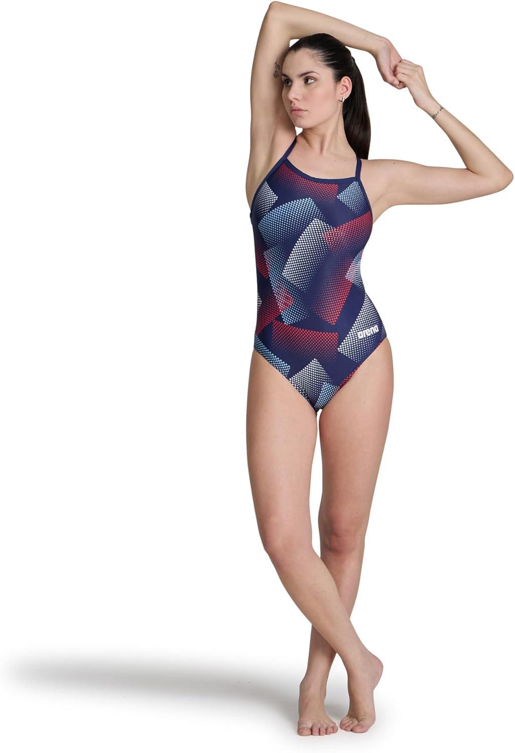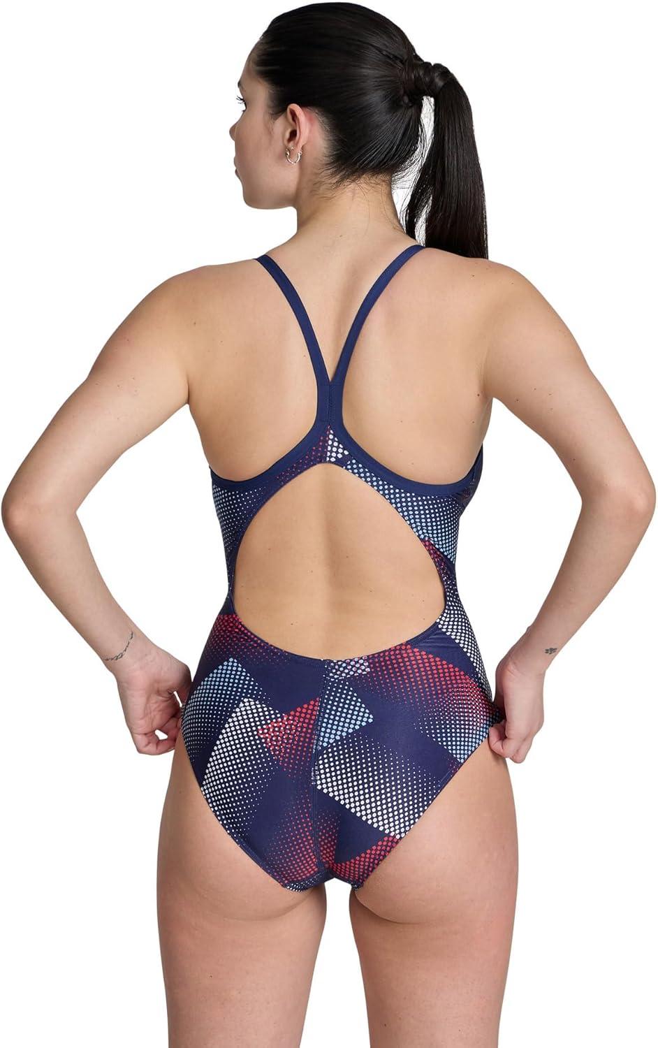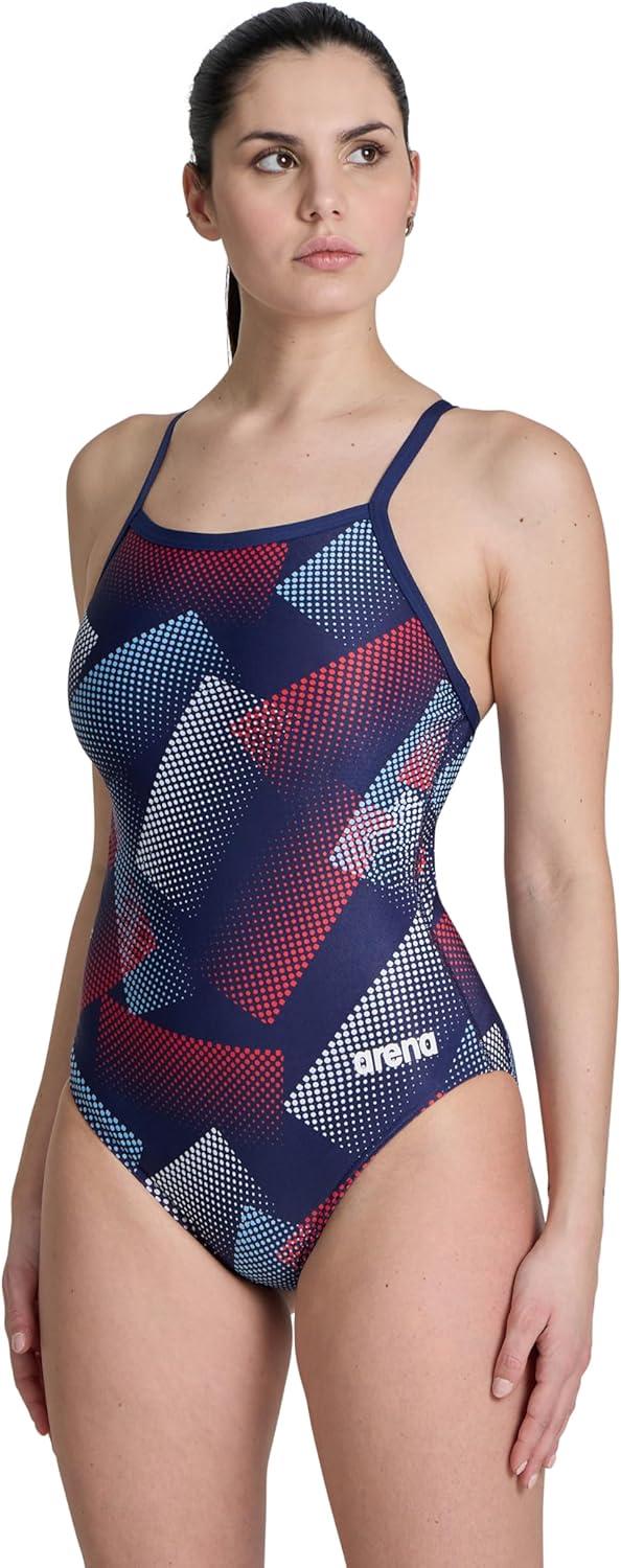 Arena Womens Performance Halftone Team Print Swimsuit Light Drop Back Pro Training Bathing Suit(Navy/Team Red White Blue)